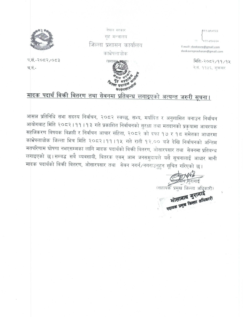 © सर्वाधिकार सुरक्षित जिल्ला प्रशासन कार्यालय, काभ्रेपलाञ्चोक .