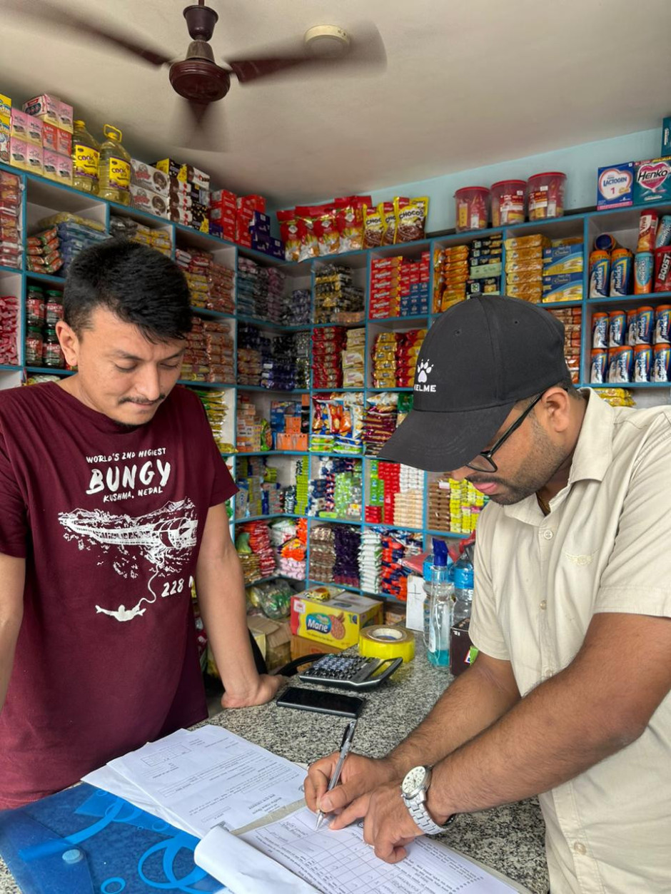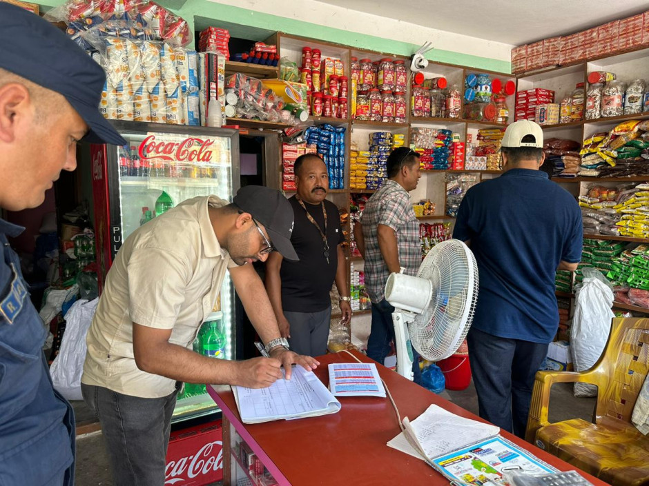 आज मिति २०८०/०६/०५ गते सहायक प्रमुख जिल्ला अधिकारी श्री आनन्द पौडेलको संयोजकत्वमा घरेलु तजा साना उद्योग कार्यालय, उद्योग वाणिज्य संघ, स्थानीय तह वडा अध्यक्ष, राष्ट्रिय उपभोक्ता मञ्च, पत्रकार महासंघ लगायतको उपस्थितीमा मण्डनदेउपुर न.पा. वडा नं. ६ को सीपाघाट वजार क्षेत्रमा किराना पसल, होटेल, मेडिकल, भेटेरेनरी तथा एग्रोभेट, फलफूल, तरकारी, माछा, मासु, सुनचाँदी लगायत ५४ वटा पसल उद्योग फर्महरुको अनुगमन गरिएको ।