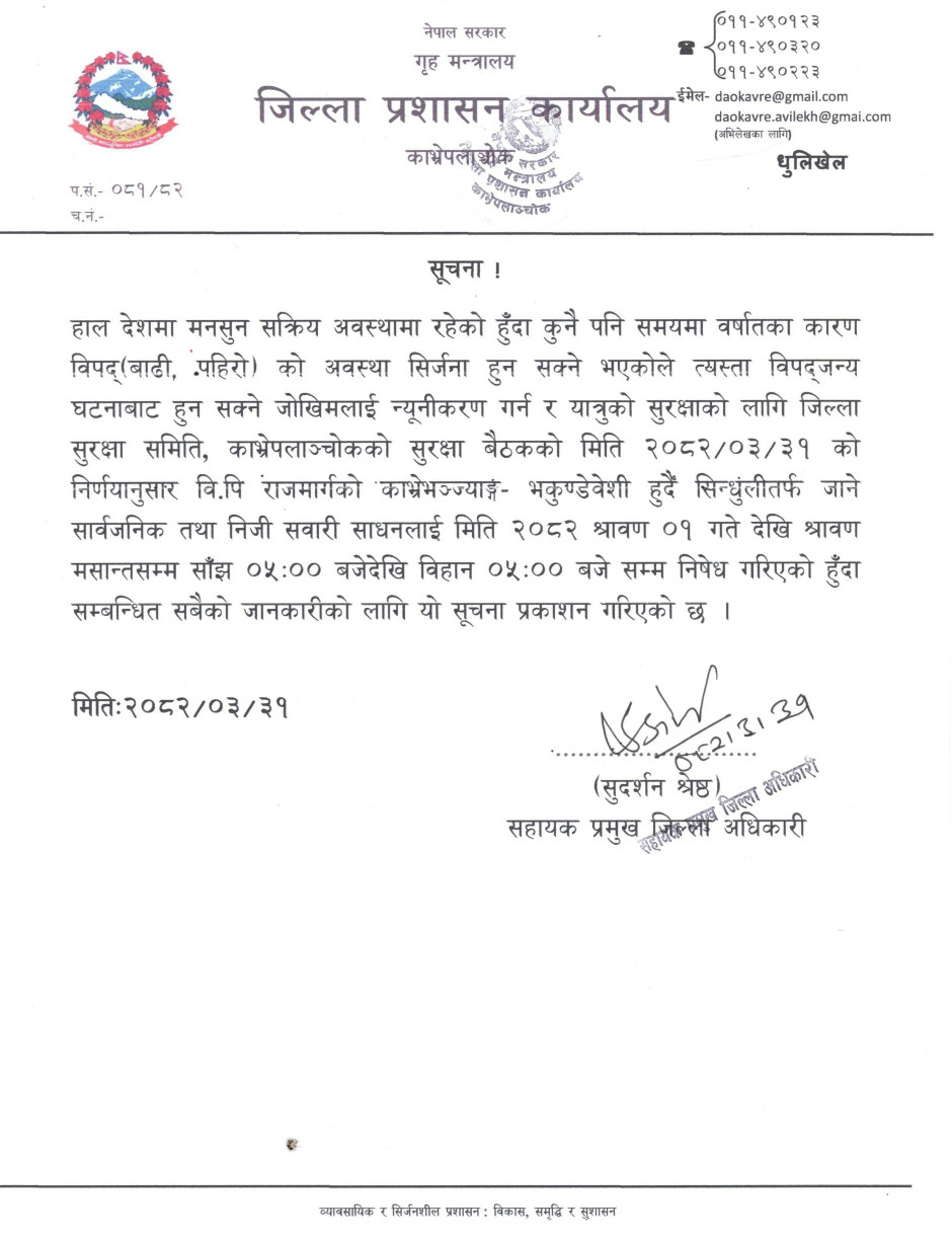 © सर्वाधिकार सुरक्षित जिल्ला प्रशासन कार्यालय, काभ्रेपलाञ्चोक .